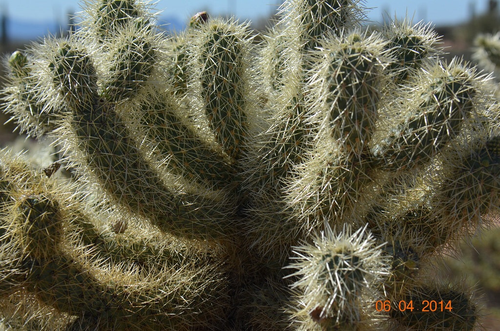 The cactus we were most warned about was the Jumping Cholla and this is the one Jesse had the most fun with. Also known as Teddy Bear Cactus, which strangely appealed to our daughter. From a distance the branches look very fuzzy, almost like fur. But on closer inspection you see it is packed full of silvery spines.